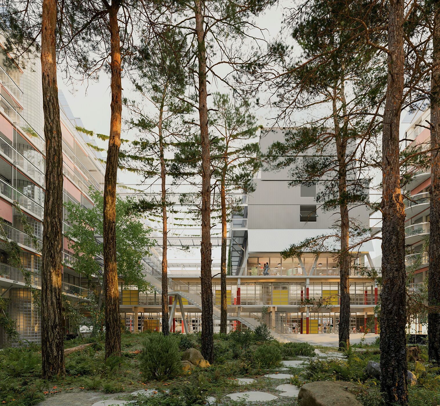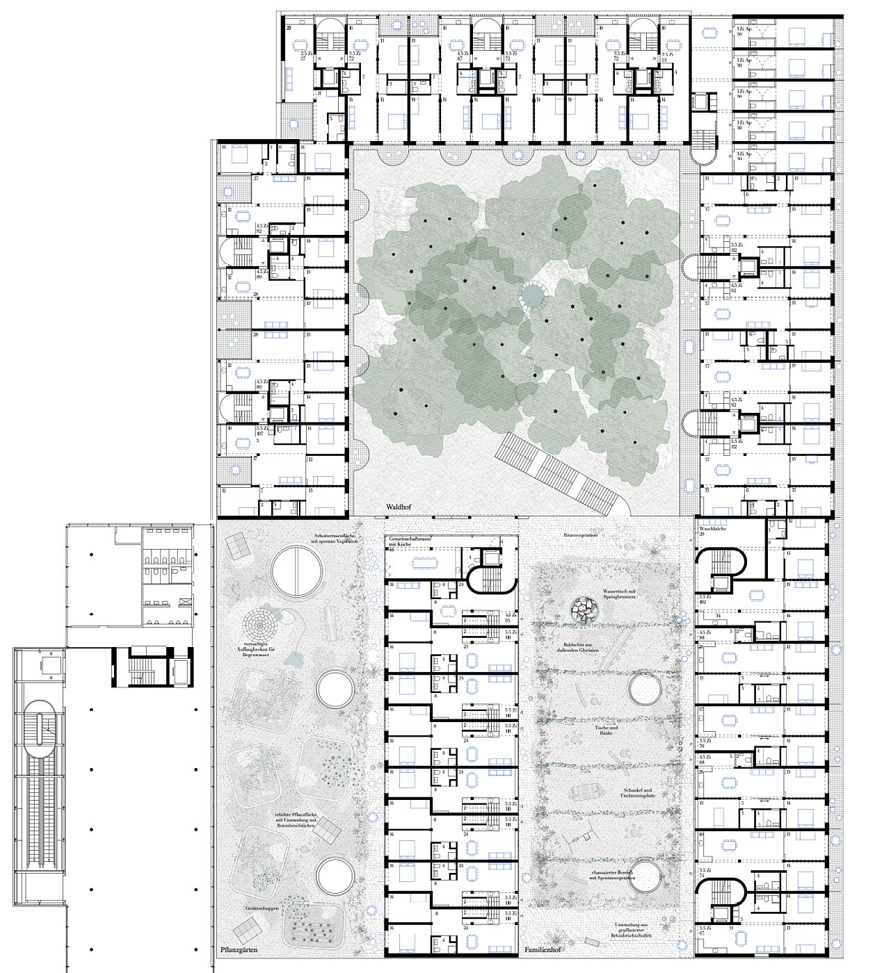 A light forest garden with tall trees such as Scots pine and oakcharacterizes the inner courtyard. Without any substructure, a “wilderness” can establish itself here as a refuge and habitat for people, plants, and animals. The family courtyard is covered with a carpet of gravel and bordered by paved concrete rubble as a threshold and transition to the residential building. Here, low-growing spontaneous vegetation will establish itself between cracks, joints, and the gravel. The planting gardens are located on the quiet side of the house. Roof water is collected in a tower-like catchment basin and used for irrigation. The excess water is filtered and finally reaches the water table with a fountain and sunken water basin in the forest garden of the farm on the ground floor. The remaining water is fed to the forest plants before it finally seeps away.